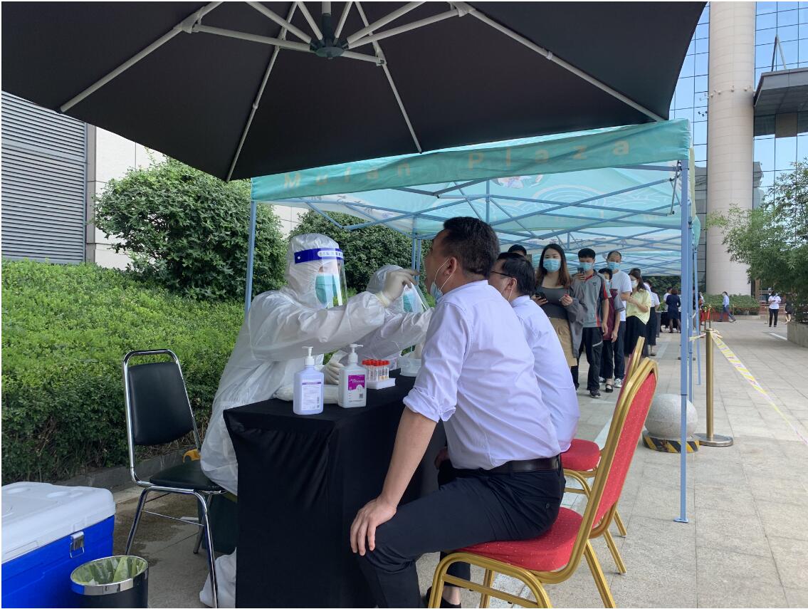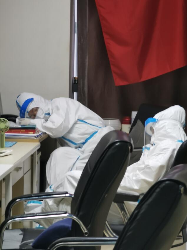 現場一遍遍消殺、消毒,維持秩序的物業工作人員